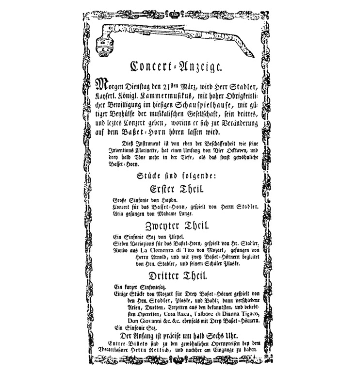 Left: A program featuring Mozart's Clarinet Concerto, concert by Anton Stadler on March 21, 1794 in Riga. Johan von Kalker: Die Geschichte der Klarinetten. Eine Dokumentation. Textilwerkstatt Oberems, 1997, S. 146.